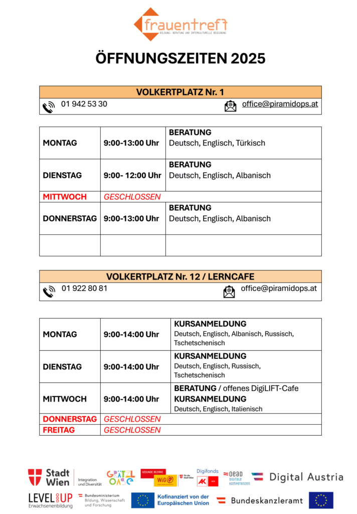 Wir freuen uns über ehrenamtliche Unterstützung! Hast du Lust auf eine Sprachpartnerschaft mit einer Deutschlernerin? Oder möchtest du eine Konversationsgruppe leiten, dein Grätzl in Form von Stadtspaziergängen herzeigen oder einfach eine Aktivität mit anderen Frauen teilen, die dir Spaß macht? Wir sind offen für vieles! Komm einfach im Lerncafe vorbei oder melde dich unter office@piramidops.at