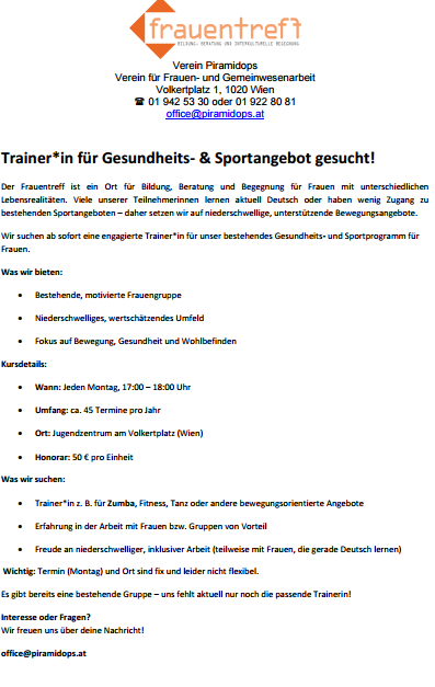 Der Verein Piramidops sucht ehrenamtliche Unterstützerinnen, die Frauen beim Deutschlernen begleiten und beim Aufbau von sozialen Kontakten unterstützen möchten.
